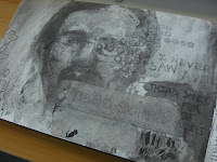 Here are a couple of process shots of an assignment I am working for my color works class. The assignment is that we have to create a self-portrait depicting the the disturbing side of our personality. I felt is this was go time to really GEEK out, and do something fun and bizarre. I am not really into horror, but with Halloween right around the corner I felt it was good time break out the zombies, rotten teeth and the chainsaw, what fun. Aside from that, I really starting to embrace the whole process of creating an image. From the thumbnail, to the work up sketch, to final piece.